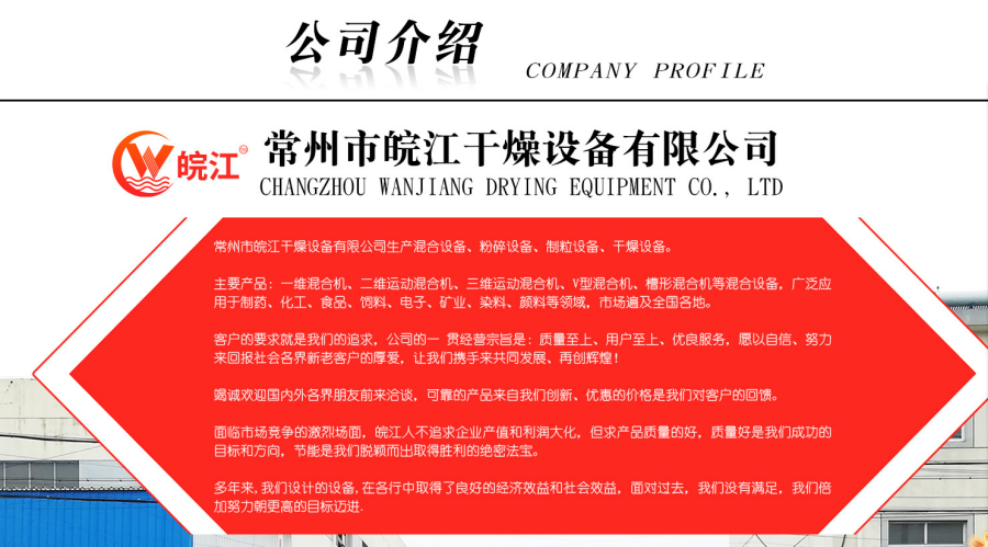 常州市皖江干燥設備有限公司專業生產干燥設備、混合設備、粉碎設備、制粒設備,主要產品:一維混合機、二維運動混合機、三維運動混合機、V型混合機、槽形混合機等混合設備,廣泛應用于制藥、化工、食品、飼料、電子、礦業、染料、顏料等領域。市場遍及全國各地。 客戶的要求就是我們的追求。 公司的一貫經營宗旨是:質量可靠、用戶至上、優質服務。本著“追求卓越、創造價值”的企業精神,愿以自信、努力來回報社會各界新老客戶的厚愛,讓我們攜手來共同發展、再創輝煌!竭誠歡迎國內外各界朋友前來洽談,可靠的產品來自我們創新、優惠的價格是我們對客戶的回饋。 面臨市場競爭的激烈場面,皖江人不追求企業產值和利潤,但求產品質量好。質量好是我們成功的目標和方向,節能是我們脫穎而出取得勝利的絕密法寶。設備節能是我們皖江人的社會責任。多年來,我們設計的設備,在各行中取得了良好的經濟效益和社會效益,我們也會倍加努力朝更高的目標邁進。