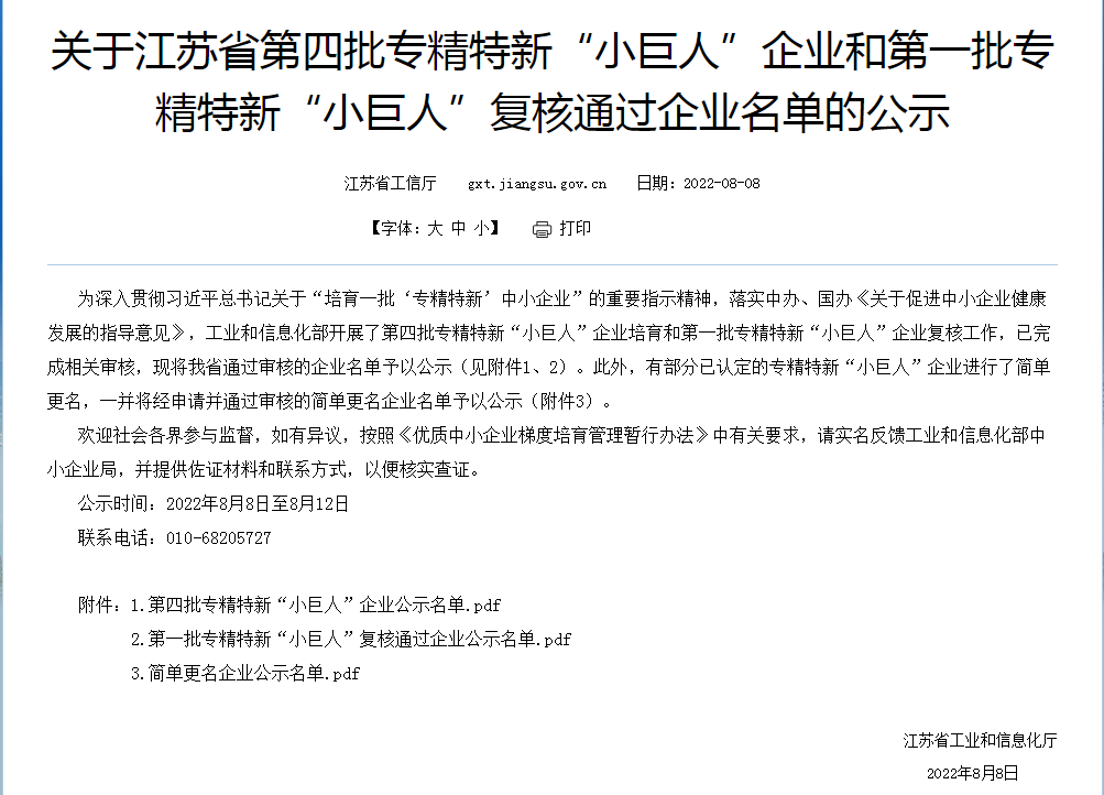 2022年8月8日,江蘇省工業和信息化廳公布了年度第四批國家級專精特新“小巨人”通過企業名單,江蘇宇通經過各項審核成功入圍并予以公示。