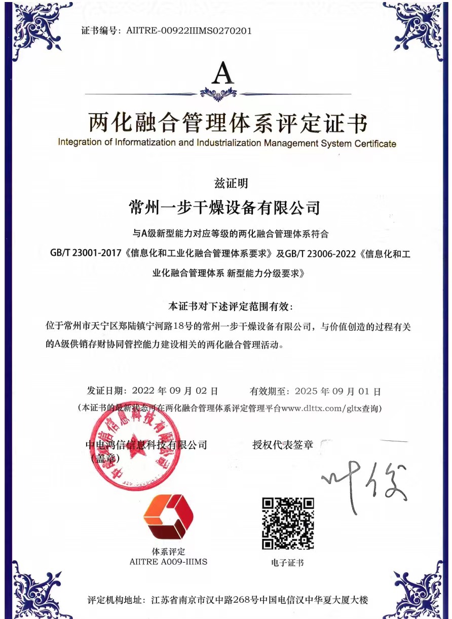 2022年9月2日,常州一步干燥設(shè)備有限公司成功獲得《兩化融合管理體系評(píng)定證書(shū)》,這標(biāo)志著我司在推進(jìn)工業(yè)化和信息化融合方面取得了新的突破。兩化融合管理體系認(rèn)證的獲得,推動(dòng)了企業(yè)管理革新、流程優(yōu)化、技術(shù)創(chuàng)新和數(shù)據(jù)開(kāi)發(fā)利用工作。…