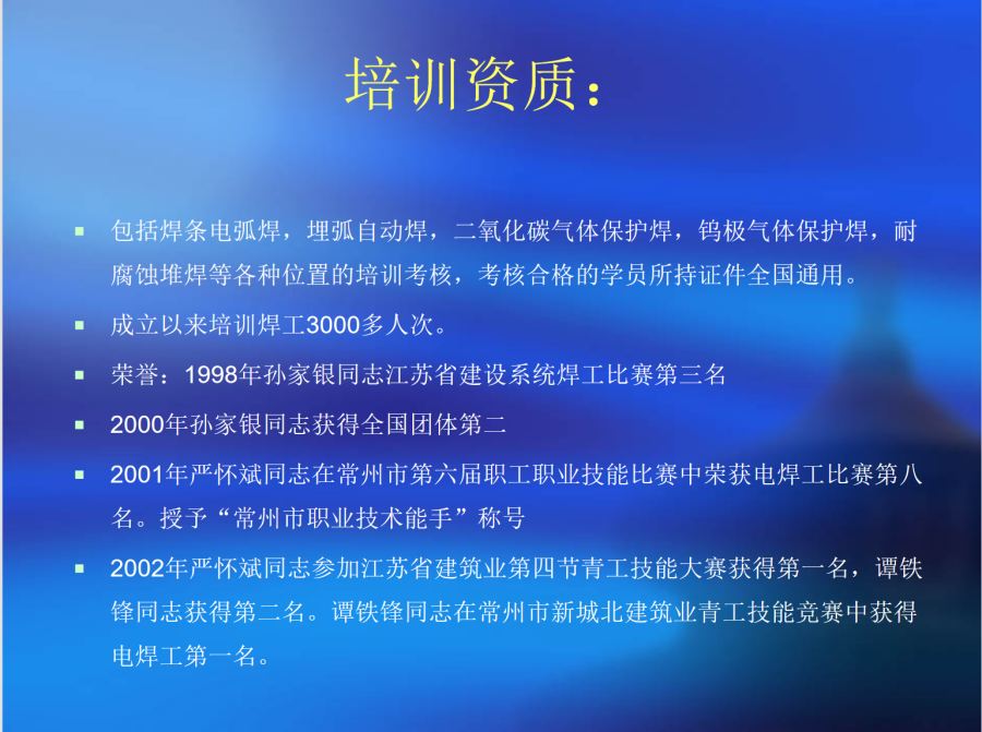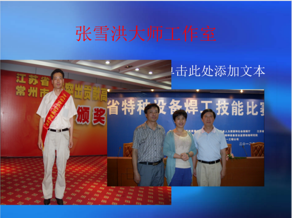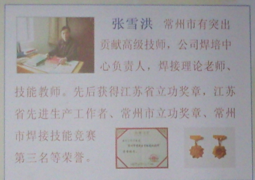 張雪洪:常州市特種設(shè)備焊工培訓(xùn)中心,焊工考試機(jī)構(gòu)主任, 常州市有突出貢獻(xiàn)高級(jí)技師,公司焊培中心負(fù)責(zé)人,焊接理論老師、技能教師,先后獲得江蘇省立功獎(jiǎng)?wù)拢K省先進(jìn)生產(chǎn)工作者、常州市立功獎(jiǎng)?wù)隆⒊V菔泻附蛹寄芨?jìng)賽第三名等榮譽(yù)